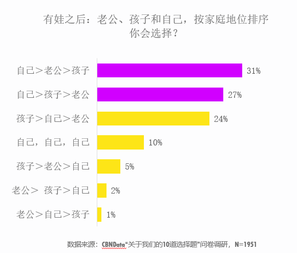 CBNData問(wèn)卷調(diào)研數(shù)據(jù)顯示,近60%的婚后女性在“自己、老公、孩子”的地位排序中,選擇將自我放在第一位。