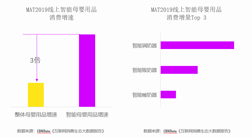 CBNData《報(bào)告》顯示,線(xiàn)上智能母嬰用品以高于整體品類(lèi)平均3倍的增速發(fā)展,其中智能調(diào)奶器、智能吸奶器、智能暖奶器最受歡迎。