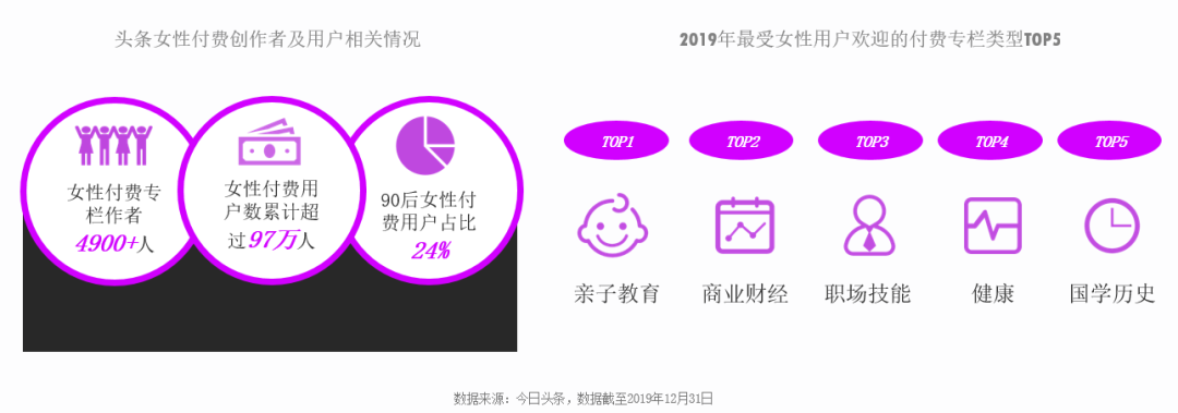 同時(shí),越來(lái)越多的女性讀者開(kāi)始愿意為優(yōu)質(zhì)內(nèi)容買(mǎi)單。以今日頭條為例,截至2019年底,全年平臺(tái)女性付費(fèi)專(zhuān)欄作者近5000人,女性付費(fèi)用戶(hù)有近百萬(wàn),其中90后占24%。在所有的付費(fèi)專(zhuān)欄里,親子教育、商業(yè)財(cái)經(jīng)和職場(chǎng)技能類(lèi)專(zhuān)欄最受女性用戶(hù)喜歡。
