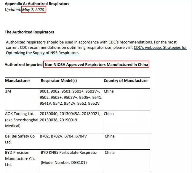 5月7日,美國(guó)FDA更新了針對(duì)中國(guó)生產(chǎn)的未獲NIOSH認(rèn)證的口罩獲得EUA授權(quán)的文件,獲得FDA認(rèn)可的中國(guó)生產(chǎn)的非NIOSH認(rèn)證的口罩只剩下14個(gè)廠家。
