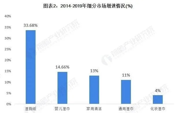 隨著我國人民個(gè)人衛(wèi)生意識(shí)的不斷提高,人們對濕巾的需求越來越大,對濕巾品類和原料的要求也越來越高。因此濕巾品類不斷豐富,出現(xiàn)更多具有較強(qiáng)針對性的產(chǎn)品,比如濕廁紙、嬰兒用紙、廚房濕巾、卸妝濕巾等。目前我國市場中嬰兒濕巾仍占據(jù)主要市場份額,但濕廁紙?jiān)鏊傺该停哌_(dá)33.68%,有望趕超嬰兒濕巾。