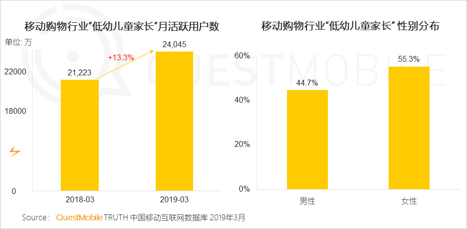 在線消費(fèi)領(lǐng)域,2019年3月網(wǎng)購(gòu)的“低幼兒童家長(zhǎng)”人群同比增長(zhǎng)13.3%;其中移動(dòng)購(gòu)物行業(yè)”低幼兒童家長(zhǎng)“性別分布上來(lái)看,男性占44.7%,女性占到55.3%。可見(jiàn)得“寶媽”者得市場(chǎng),女性的占比顯著高于男性。