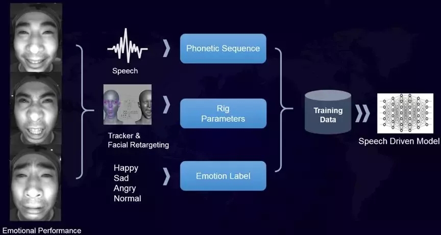 為此,團隊建立了一套精確的面部動捕流程,以不同情感下的動作捕捉,來訓練語音驅(qū)動模型,最終構(gòu)造了一個長約20個小時、13339條語句的,包含語音、面部運動和身體運動的多模態(tài)訓練數(shù)據(jù)集。在Siren AI 基礎(chǔ)上,增加情感維度數(shù)據(jù),讓Matt擁有微笑、蹙眉等微表情,多了更自然的“人情味”。