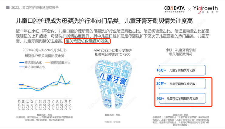 在此背景下,一場(chǎng)兒童口腔健康“保衛(wèi)戰(zhàn)”,在年輕育兒家庭中開(kāi)始打響。從《兒童口腔護(hù)理市場(chǎng)觀察報(bào)告》中獲悉,在小紅書(shū)平臺(tái)內(nèi),兒童口腔護(hù)理所屬的母嬰洗護(hù)行業(yè)筆記篇數(shù)占比、筆記閱讀量占比、筆記互動(dòng)量占比都呈現(xiàn)明顯的上升趨勢(shì)。