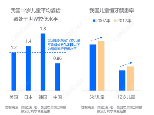 根據(jù)第四次全國(guó)口腔健康流行病學(xué)調(diào)查結(jié)果顯示,中國(guó)5歲兒童乳牙齲患(即蛀牙)率為70.9%,12歲兒童恒牙齲患率為34.5%。與十年前相比,5歲和12歲兒童齲患率分別上升了5.8%、7.8%。這也意味著,我國(guó)兒童口腔問(wèn)題日益加劇。