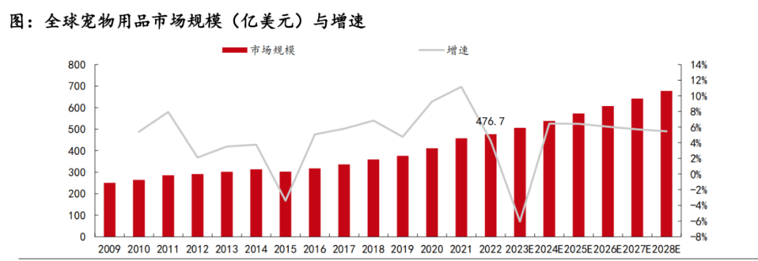 根據(jù)歐睿國際數(shù)據(jù)顯示,2019-2021年寵物用品市場增速分別為4.76%、9.28%、11.16%。2022年增速有所放緩,僅為4.28%,全球?qū)櫸镉闷芬?guī)模達(dá)477.68億美元,2019-2022年復(fù)合增長率為8.20%,預(yù)計2022-2028年寵物用品復(fù)合年均增長率為3.03%,寵物用品市場規(guī)模將達(dá)到677.25億美元。