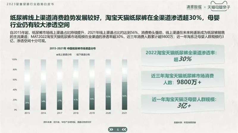 截止2021年,一半以上的紙尿褲都是由線上渠道賣(mài)出,消費(fèi)勢(shì)頭強(qiáng)勢(shì)。近三年消費(fèi)人數(shù)累計(jì)超9800萬(wàn),近一年淘系泛母嬰人群已有3億+規(guī)模。