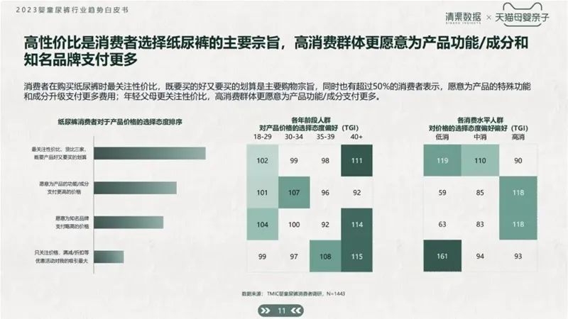 根據(jù)白皮書數(shù)據(jù)顯示,消費(fèi)者在購買紙尿褲時(shí)最關(guān)注性價(jià)比,“又好又劃算”是主要購物宗旨,同時(shí)也有超過50%的消費(fèi)者表示,愿意為產(chǎn)品的特殊功能和成分升級支付更多費(fèi)用:年輕父母更關(guān)注性價(jià)比,高消費(fèi)群體更愿意為產(chǎn)品功能/成分支付更多。