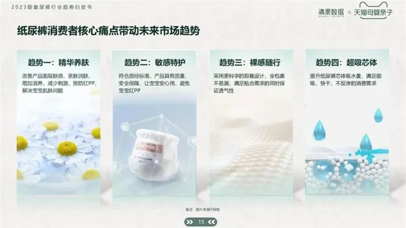 為解決6月齡內(nèi)新生兒的紅屁屁問題;1歲齡左右寶寶的側(cè)漏后漏問題;以及隨著寶寶年齡增長,對紙尿褲吸水量需求變大、紙尿褲表層潮濕等問題,有超過50%的消費(fèi)者表示,愿意為產(chǎn)品的特殊功能和成分升級支付更多費(fèi)用。延伸出了精華養(yǎng)膚、敏感特護(hù)、裸感隨行、超吸芯體四大趨勢。