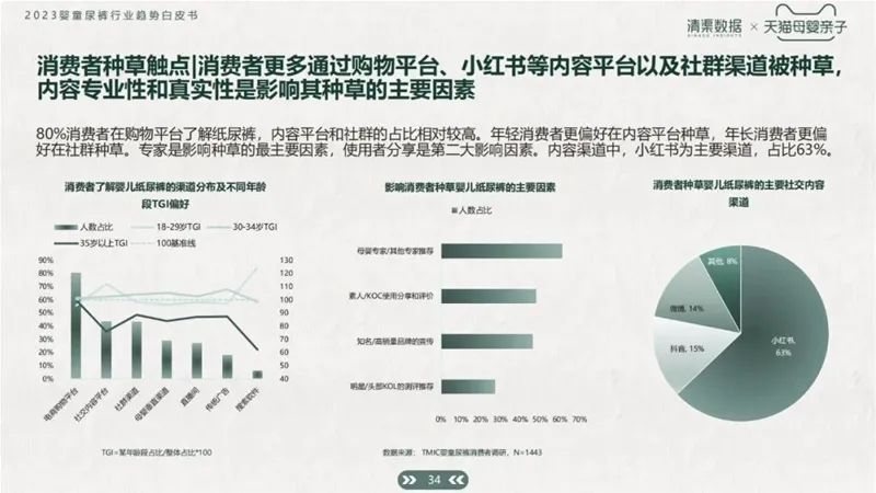 根據(jù)白皮書數(shù)據(jù)統(tǒng)計(jì),80%消費(fèi)者在購物平臺了解紙尿褲,內(nèi)容平臺和社群的占比相對較高。年輕消費(fèi)者更偏好在內(nèi)容平臺種草,年長消費(fèi)者更偏好在社群種草。專家是影響種草的最主要因素,使用者分享是第二大影響因素。內(nèi)容渠道中,小紅書為主要渠道,占比63%。