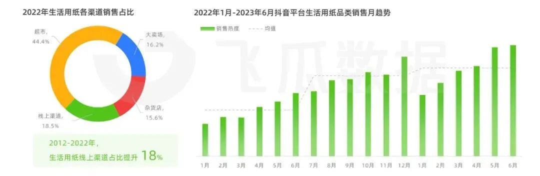 不可否認(rèn),從現(xiàn)階段分渠道來(lái)看,線下商超仍是人們購(gòu)買生活用紙的首要渠道,22年銷售占比超過(guò)44%。