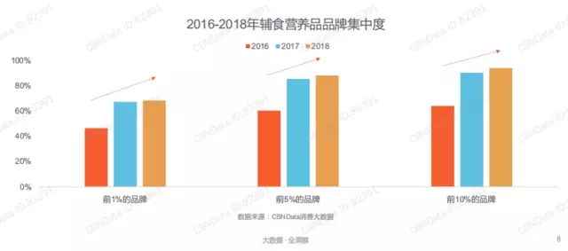 目前輔食營(yíng)養(yǎng)品大致分為嬰幼兒營(yíng)養(yǎng)品、寶寶輔食、寶寶零食、嬰幼兒調(diào)味品四個(gè)子品類。從上圖我們不難看出,從2016年—2018年嬰幼兒營(yíng)養(yǎng)品從不足50%提升至50%以上,銷售占比逐年提升,發(fā)展態(tài)勢(shì)一片大好。一方面,“生命早期1000天營(yíng)養(yǎng)健康”在政府層面的確立,更是為嬰兒營(yíng)養(yǎng)品打開了市場(chǎng)的大門;另一方面,在優(yōu)生優(yōu)育觀念的影響下,孕育下一代成為每個(gè)家庭的頭等大事,嬰幼兒營(yíng)養(yǎng)品的市場(chǎng)占比與熱度日益提升。